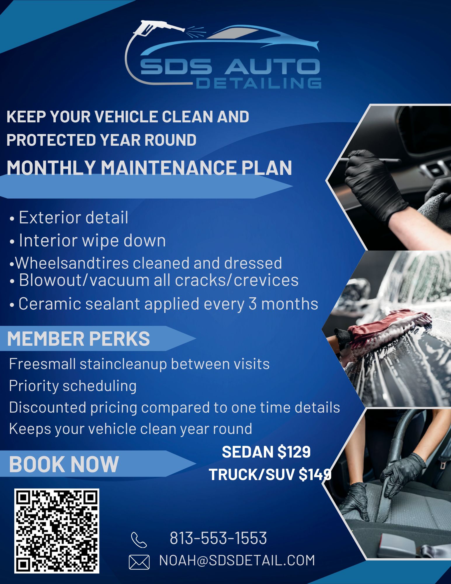 No more dropping your car off or waiting at a shop. SDS Auto Detailing brings full-service mobile detailing directly to your driveway across the Southshore area. From deep interior cleaning to exterior hand washing, waxing, and ceramic coatings, every vehicle receives showroom-quality care with attention you can see and feel.